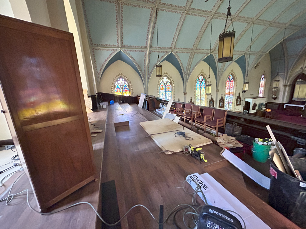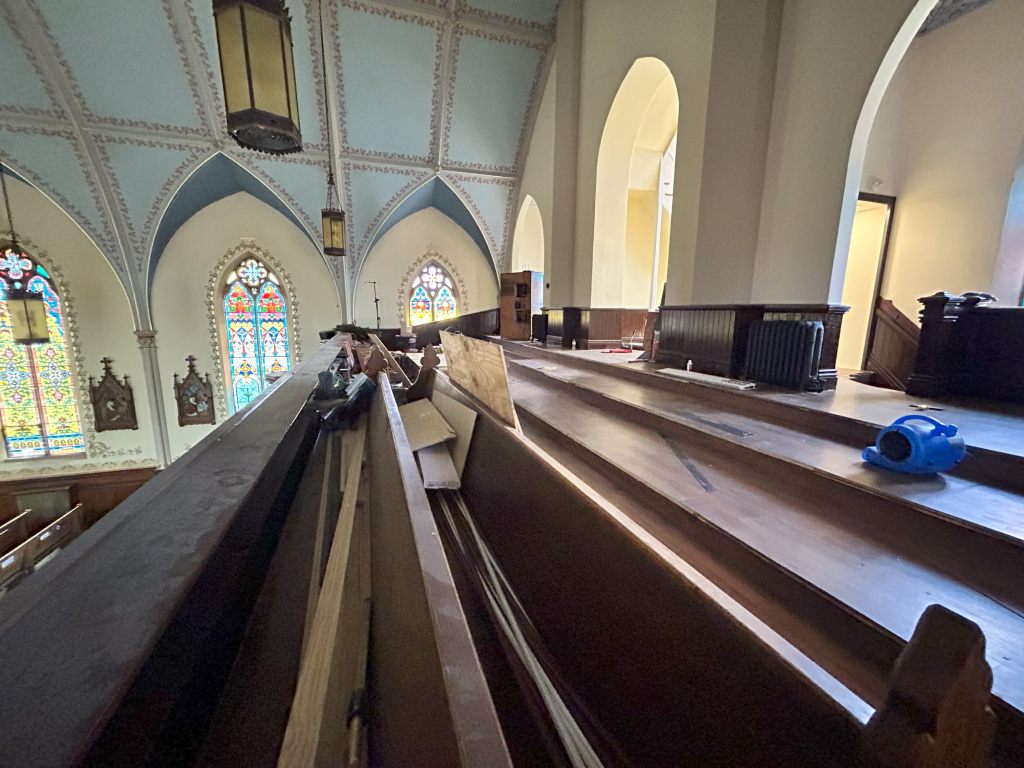 For more seating in the church and the need for choir space area, the choir loft was reconstructed to the original design. Organ and pipes were removed and the main window that illuminates the Sanctuary was discovered. The structure was reinforced. New electrical and sound and the floor were replaced. Half walls and stairs were restored to the original design. Walls and ceilings were restored and painted. New sound, video, and music equipment was replaced. The decal is still in process.